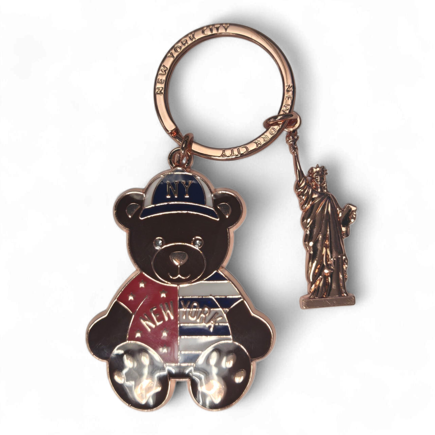 New York Teddy Bear Enamel Keyring - Brown. All new Enamel and Metal Charm Keychains with vibrant enamel coloring and Rose Gold colored polished metal. Built to last and remind you of NYC every time you take out your keys. Available in Multiple colors.