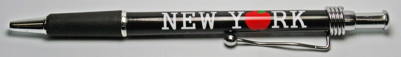 Product Description The NY Big Apple Retractable Pen is a fan favorite. Writes in black ink, and it very light. Bulk Discounts available.