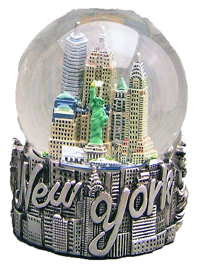 This medium snowglobe features all of NY's Icons in full color inside the waterball. On the silver colored base is pictured the NY Skyline and New York in large script lettering. Measures Approximately 4.5 inches tall, waterball is 65mm diameter.