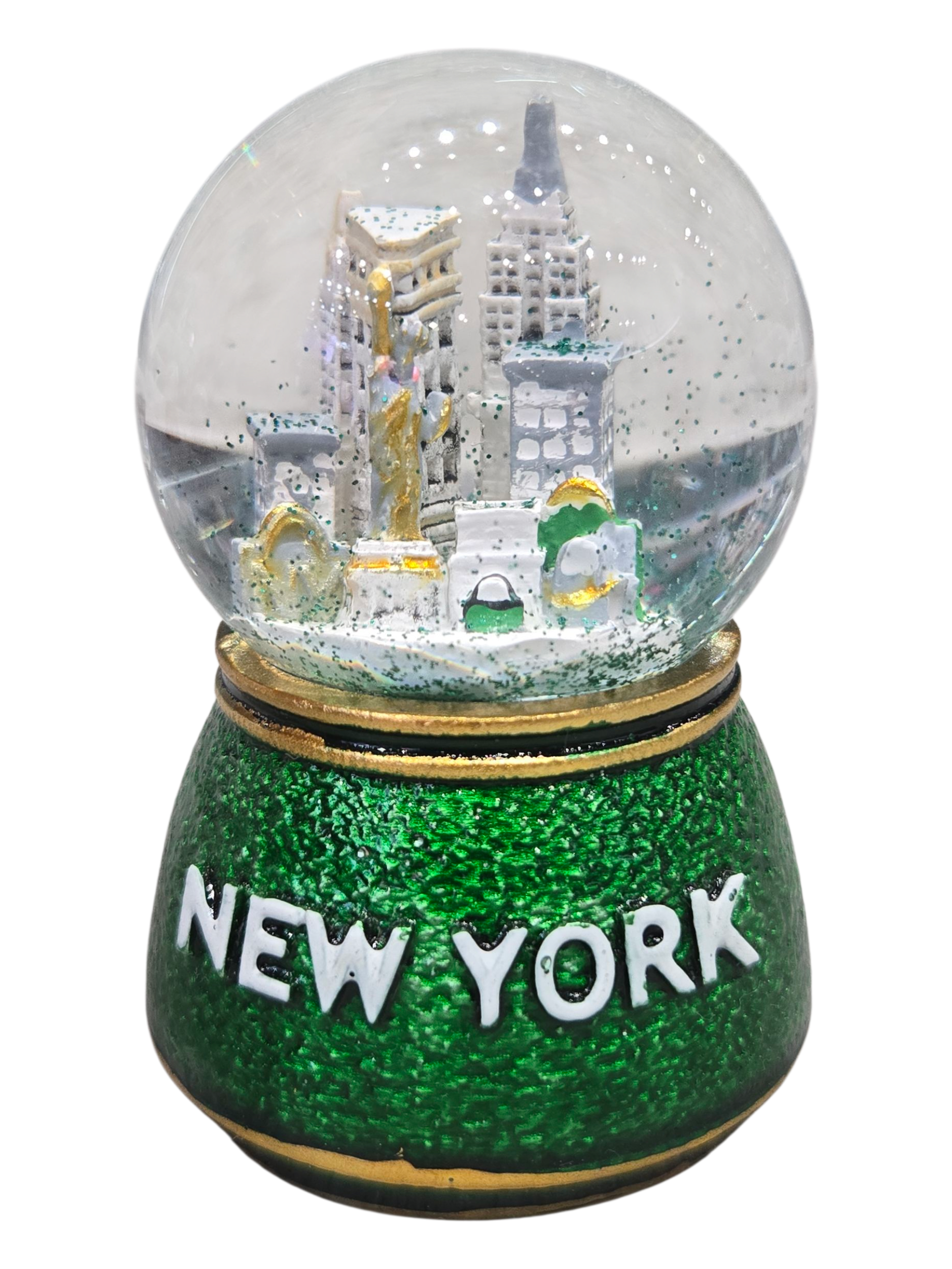 Shake up New York City whenever you want with the NY Shopping 45mm Snowglobe in Christmas green. It features a New York themed quilted shopping base in balck and gold with vintage gold colored NY icons inside the globe. Instead of snow, this snowglobe features gold colored glitter.