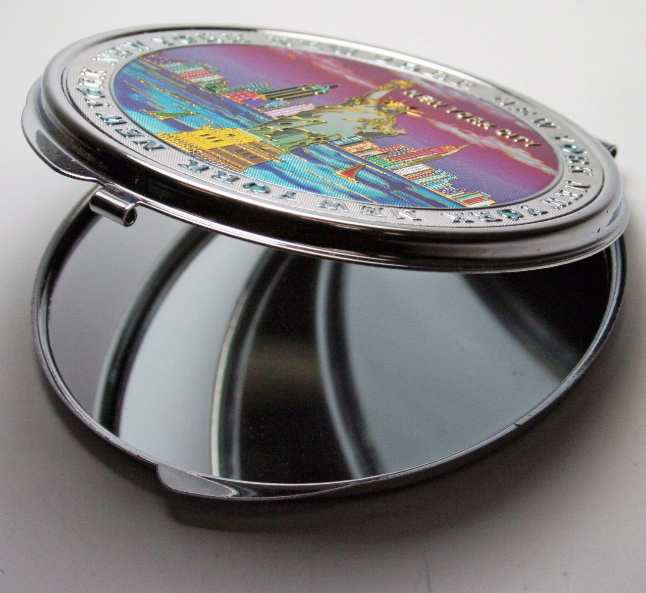 The NYC Purple Skyline Pocket Mirror will make sure you look good at all times. With beautiful detail and color this mirror will be your new companion. Made of durable metal.