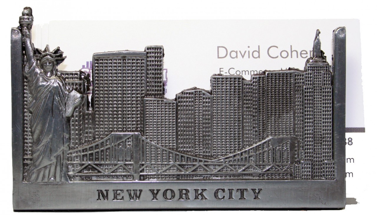 The NYC Skyline Pewter Business Card Holder makes a great desk accessory and gift for the business person. Very popular around fathers day and as a corporate gift, this business card holder features the NYC Skyline made of a pewter material and holds standard sized business cards.