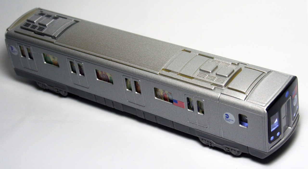 The NYC Subway Car with Lights and Sound is a gorgeous plastic replica of an official NYC Subway Car. The doors open and close as the conducter says "Please stand clear of the platform edge". The front headlights and train letter lights up in the front of the car. The train makes honking and rolling sounds when it is pulled back to ride. Measures 7 Inches long and 1.5 Inches High.
